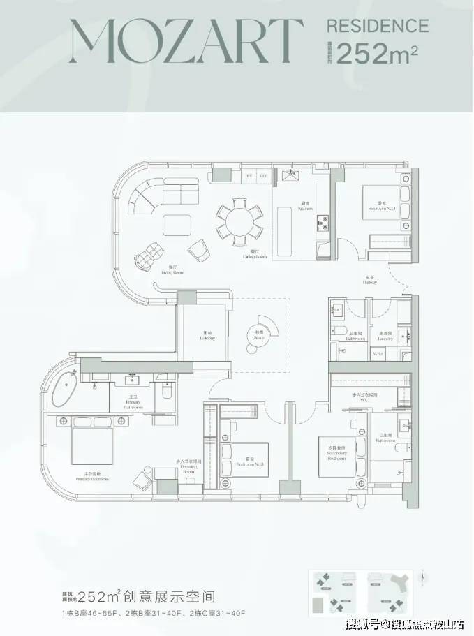 建面约252平的户型是「四居室+灵动空间+三卫」,亮点在于双厅约270°全景视野,可尽览都市繁华和自然风光;双套房设计且套房均可做步入式衣帽间,整体居住尺度更大,舒适度更高,符合刚组建家庭的实力买家居住需求。