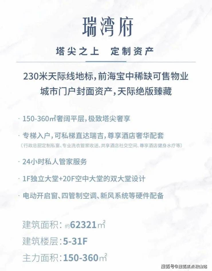 户型鉴赏项目33-50F为瑞吉酒店,5-31F瑞湾府目前在售190-360㎡酒店式行政公馆,层高4.4米。