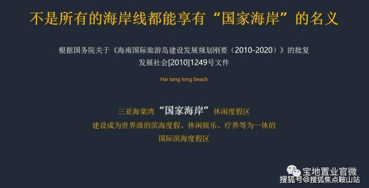 中国最南端的世界级滨海旅游城市三亚海棠湾,被誉为“国家海岸”,海棠湾19公里的湾区疆界,有山海、有清新空气、清洁水源;有数十万亩热带农业观光园、三亚保持最好的原生美景;有全球罕有的热矿医疗温泉、三亚最大山地高尔夫;有国际星级酒店群、亚洲最大的免税城……