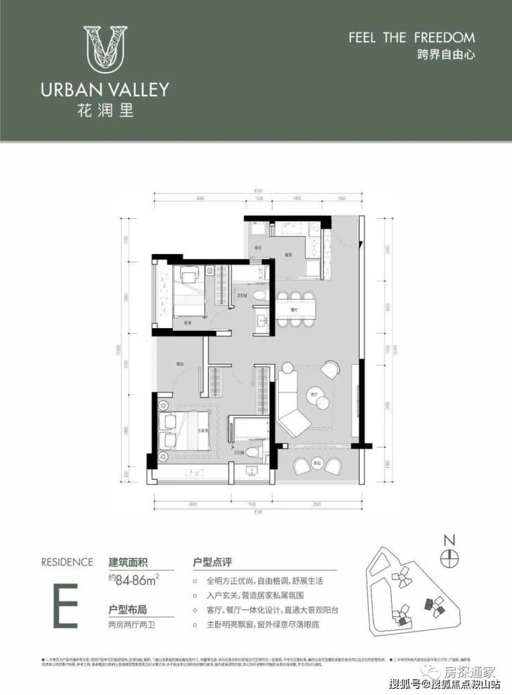 84㎡户型,全明方正格局,整体采用餐客厅一体化设计,入户玄关宽约1.55米。客餐厅的整体开间约3.5米,客厅出阳台,坐在沙发上就可以欣赏外面的山景。厨房配置了一个小阳台,可以放置洗衣机,分布在2栋和3栋,一共四条腿,朝南和朝北的都有。