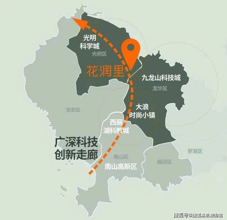 花润里门前的观光路,作为联通光明、九龙山、大浪这三个片区的核心主干道,全长15.9公里,是连接光明南高新片区和观澜-龙华,以及龙岗坂雪岗高新片区之间的重要通道。观光路沿途布局华强创意产业园、华润苹果小镇及富士康、华为、美团等具有世界级影响力企业,形成了堪称“第二深南大道”的北部产业生命走廊。