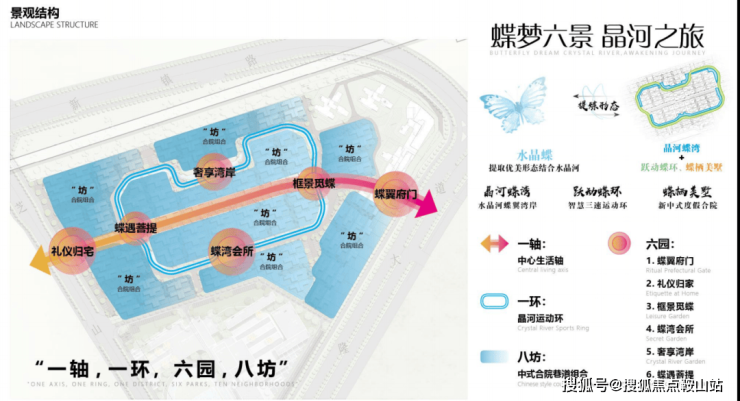 ——以“一轴”“一环”“六园”“八坊”为设计核心,打造中式园林,景观层层递进,营造出“蝶梦六景,晶河之旅”的归家体验。