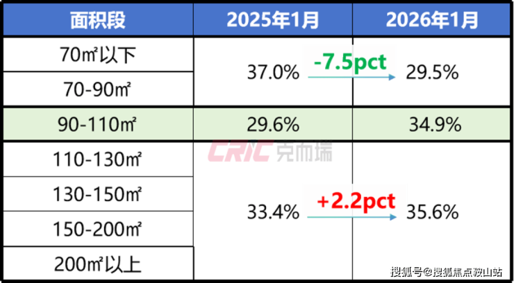 主流产品未发生根本性变化,但有一个现象值得关注,以主流产品90-110㎡为界,90㎡以下、110㎡以上占比呈现两极分化:90㎡以下刚需产品占比份额在缩小,同比减少7.5个百分点,占比不足三成;110㎡以上的市场份额在扩大,同比增加2.2个百分点,总占比35.6%反超90㎡以下刚需产品,成为市场新的支撑点。