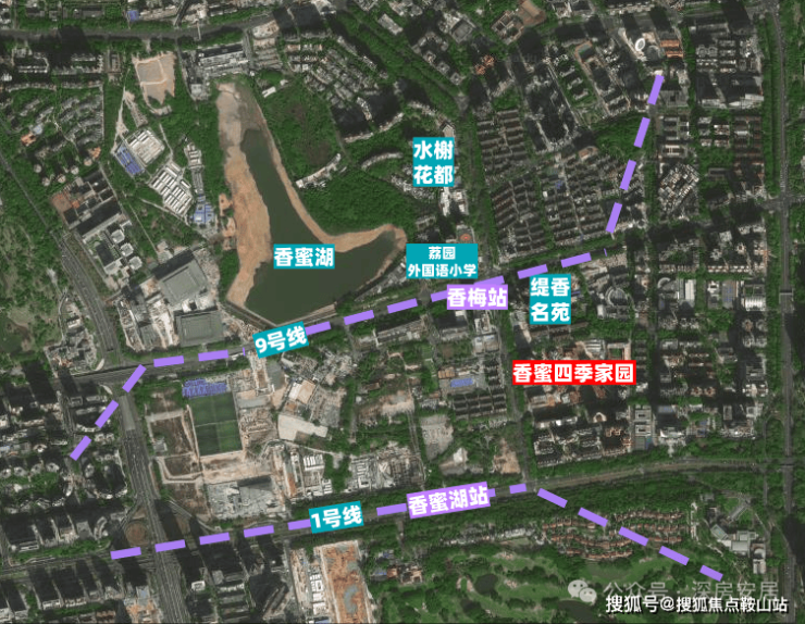 新世界香蜜四季家园」距离9号线香梅站300米,步行5分钟,1号线香蜜湖站500米,步行8分钟