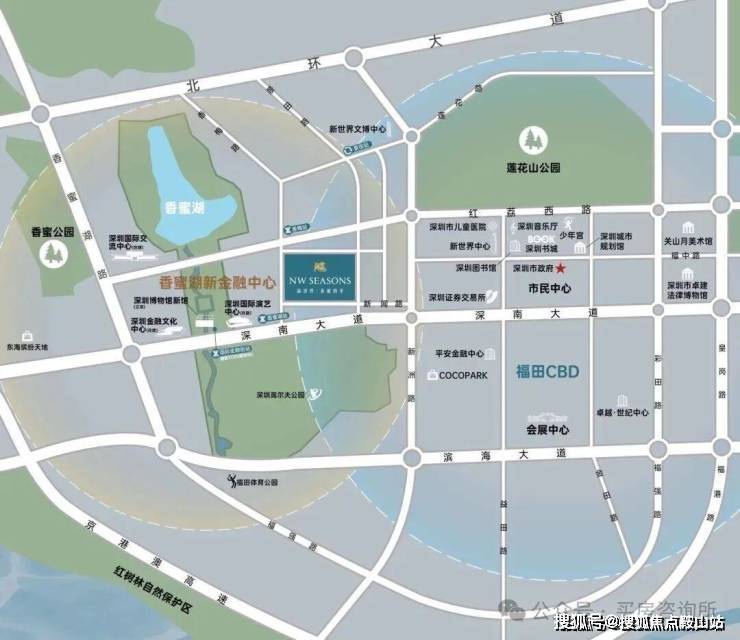 新世界香蜜四季家园位于香蜜湖新金融中心附近,按照目前规划,香蜜湖新金融中心主要分为北区和中区,中区未来将规划落成深圳金融文化中心、深圳博物馆、深圳国际演艺中心三馆,北区是深圳国际交流中心。