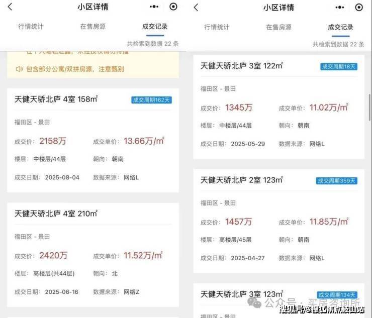 但天健天骄北庐就有点“拖后腿”,2019年8月29日,天健天骄南苑开盘,推出515套90-171㎡住宅,开盘当天售出414套,去化率80%。2020年11月28日,天健天骄北庐开盘,推出207套122-266㎡住宅,备案价11.76万,约4小时售罄。2022年6月,天健天骄西筑开盘,去化约9成。当时开盘价格约为11.4万元/平方米。2025年8月二手房最低价去到了11.52万/㎡,最高价13.66万,主要是同片区新盘竞争太激烈。加上片区随然说靠近香蜜湖但毕竟是属于景田片区,再就是学区没有香蜜湖优质,带的是荔园外国语小学(天骄校区)➕红岭教育集团科技中学。相比上面深业中城不管是地段还是学区都是有所差距的