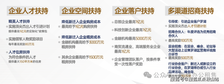 2022年6月9日,罗湖推出10亿元产业政策大礼包,涵盖企业落户扶持、企业空间扶持、企业人才扶持、多渠道招商扶持4大方面,重塑罗湖产业新未来。