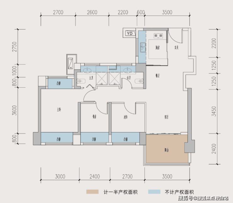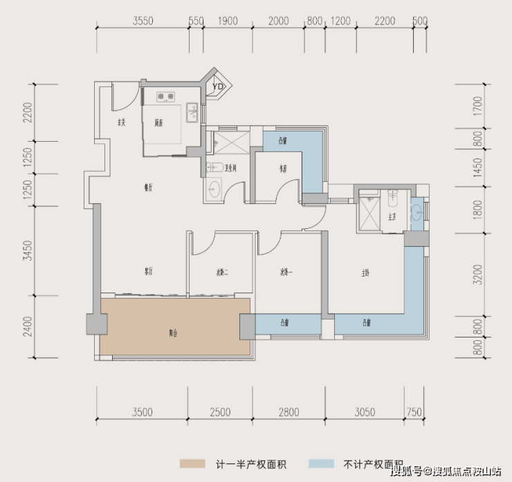 87㎡的3房2厅2卫,B户型,设计的是经典竖厅格局,进门入户玄关,客厅3.5米开间,LDKB一体化,动静分区,三开间朝南,S墙设计预留冰箱卡槽位,主卧+1个次卧270°飘窗,U型厨房,卫生间干湿分离,得房率约:77.4%(不含赠送),西南朝向。套内面积67.51㎡+赠送面积16.96㎡=实得84.47㎡,加上赠送得房率96.83%。
