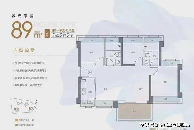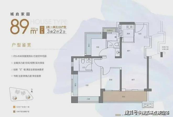 89㎡的3房2厅2卫经典竖厅格局,LDKB一体化,S墙设计预留冰箱卡槽位,动静分区,三开间朝南,主卧+1个次卧270°飘窗设计,U型厨房,公卫三段式分离,客厅连接卧室出5.45米长的大阳台,得房率约90%(包含赠送),东南朝向。