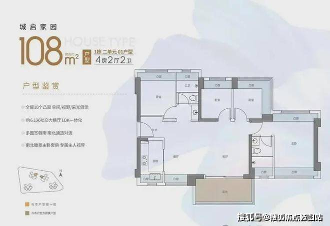 108㎡的4房2厅2卫:横厅南北通透格局,进门独立玄关,客餐厅6.1米开间,LDKB一体化,五开间朝南,主卧双飘窗通透设计,全屋10个凸窗,L型厨房,卫生间干湿分离,得房率约90%(包含赠送),阳台主朝西南或东南向。