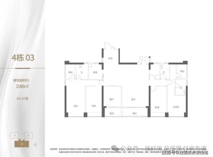· 246㎡四房:此户型为4+1房三卫,专梯入户,双龙抱珠户型,主卧+次主卧套房设计。
