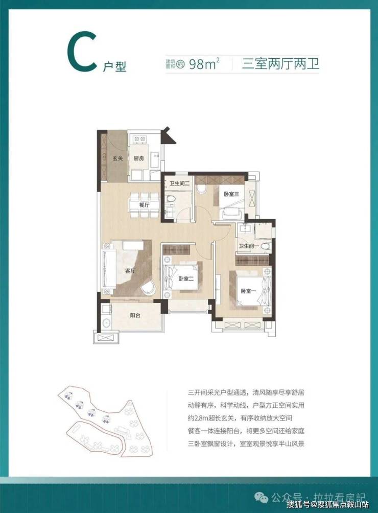 85㎡三房两厅大三房,2.8m超长玄关,270度景观飘窗,明厨明卫
