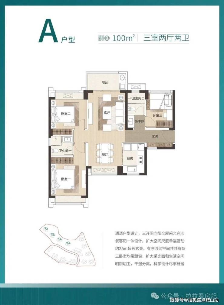 100㎡通透性三房两厅2卫大三房,2.5m超长玄关,南北通透,景观大阳台