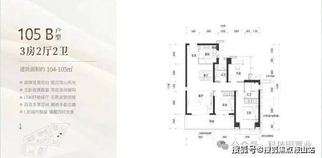 105㎡:竖厅格局,客厅与卧室连通超大阳台,LDK一体化设计,主卧室270度转角飘窗,看城市景观,主要朝向为西南和东南