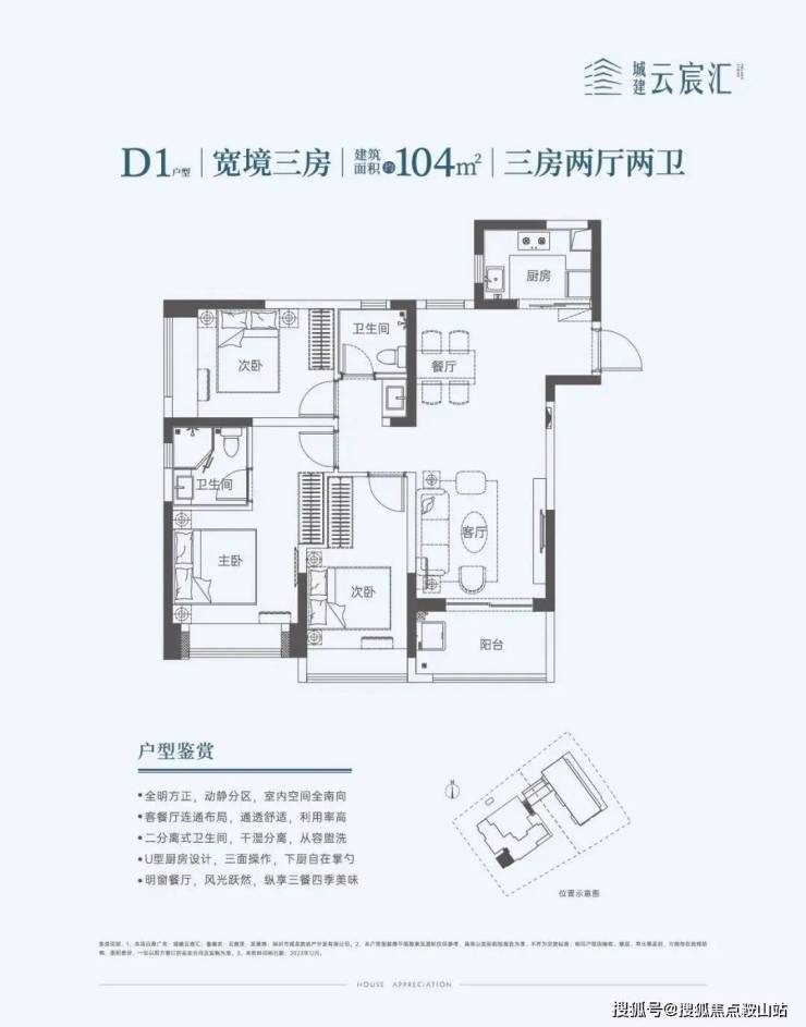 104㎡的3房2厅2卫,设计的竖厅南北通透格局,餐客厅一体化,U型厨房,阳台西南朝向。