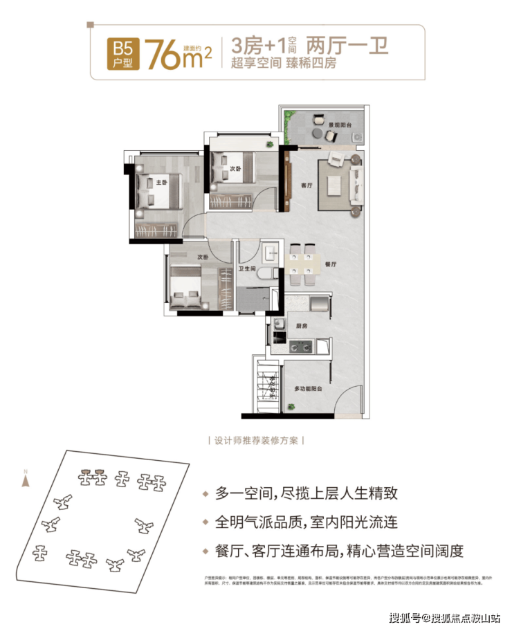 建面约76㎡3房+1空间,拥有观景阳台让孩子在自然氛围中学习、放松双眼;+1 可变空间能切换为书房或休闲区;三面采光保障孩子学习环境明亮护眼;客餐无界方便亲子互动和孩子社交。