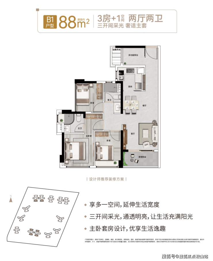 建面约88m²的3房+1空间,南向竖厅采用3开间布局,客餐空间一体化,保证屋内光线充足,公共空间尺度大幅拓展,各类场景随心切换。还有横厅户型可选,尊享约11米南向大开间,南北通透,直面中央园林美景。