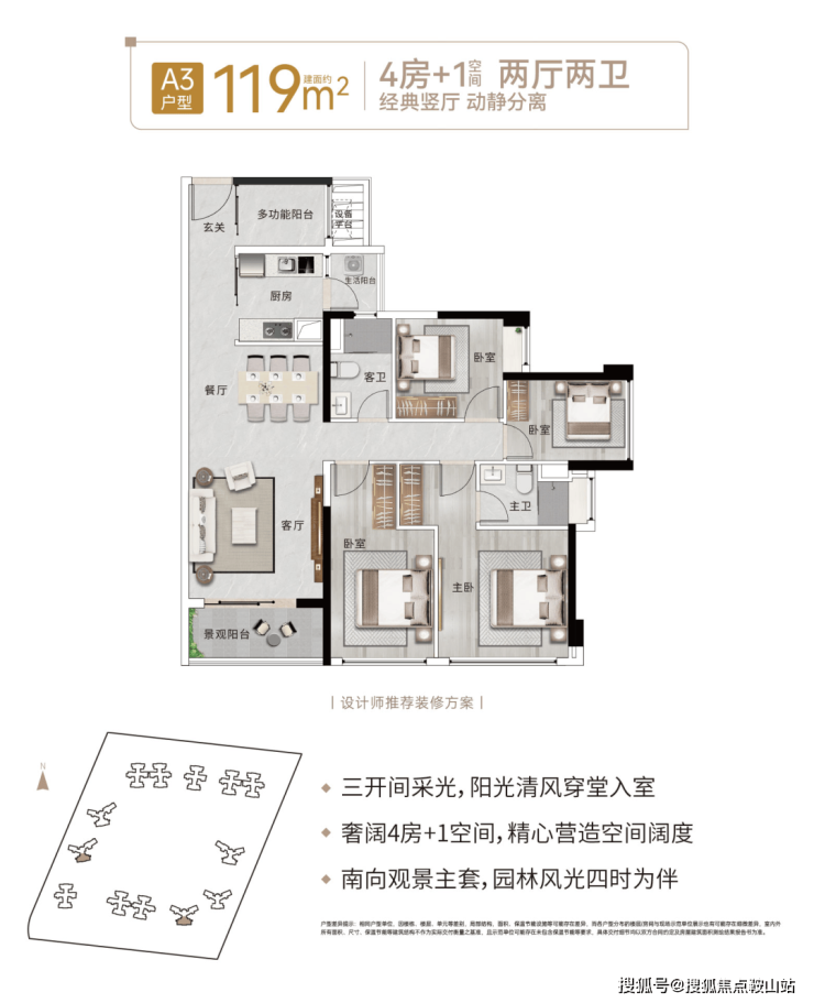 建面约119㎡的4房+1空间,以竖厅为核心,约10米南向三开间,南向奢阔主套,配步入式衣帽间,动静分区互不干扰。