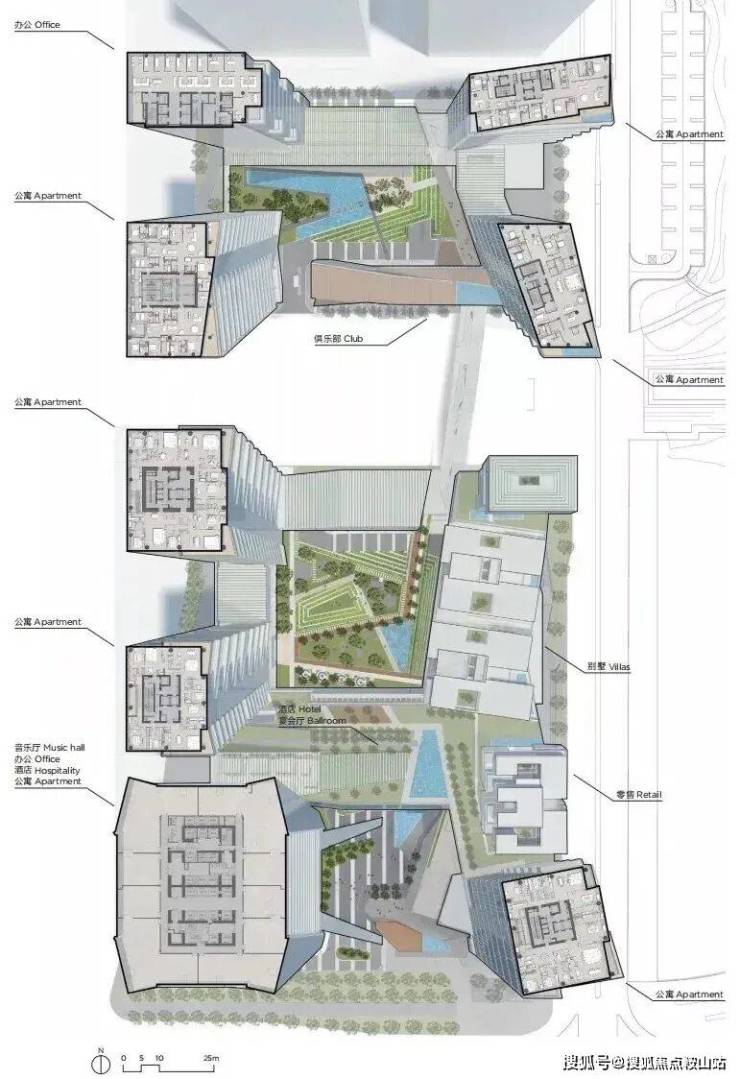 深圳湾1号由8座塔楼及1座商业建筑组成,由中央水轴分成南北区,融合顶级公寓、总部办公、传奇莱佛士酒店、定制商业及深湾会于一体。