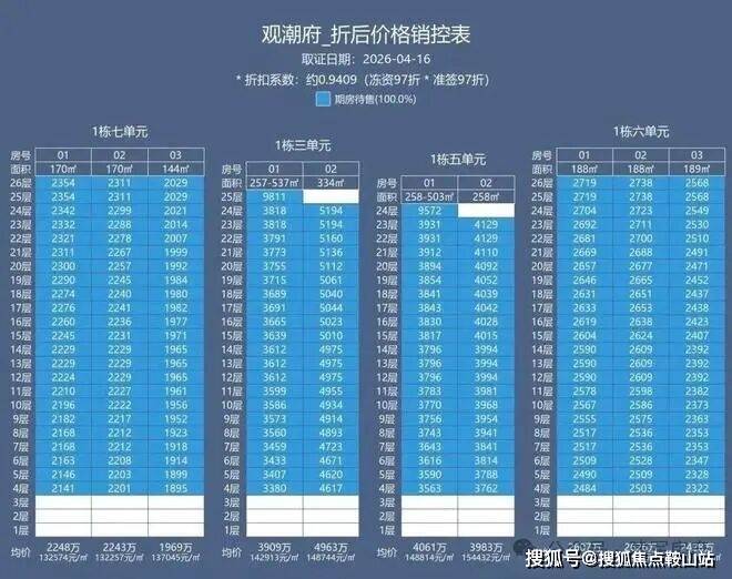 2026年4月,观潮府正处于认筹热销阶段,4月16-22日启动诚意登记+冻资,备案均价约14万/㎡,折后单价12.2万/㎡起,均价约14万/㎡,总价区间1892万-9801万。认筹冻资可享97折,按时签约再享97折,叠加开发商直营专属折扣,143㎡户型折后1892万起,332㎡顶奢户型折后4907万起,预计2028年底精装交付。