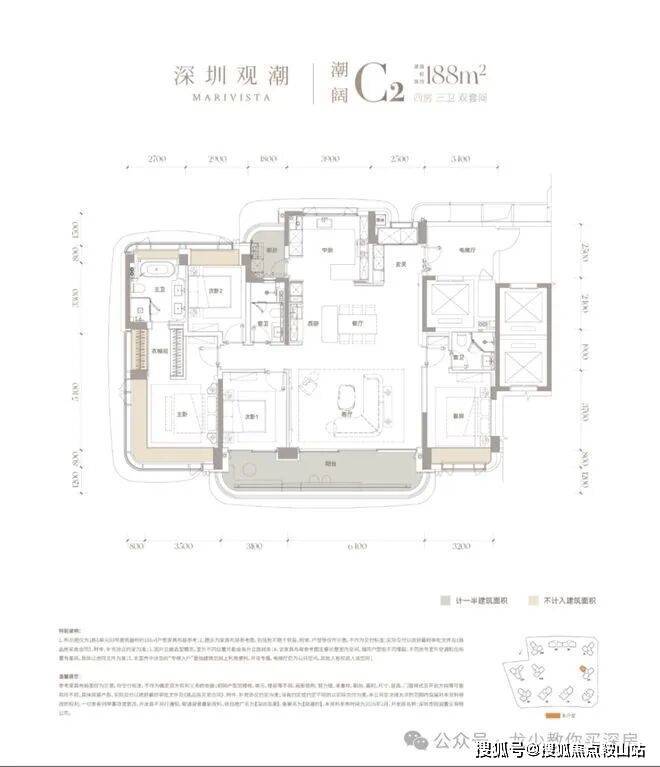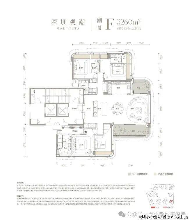 观潮府主打终极顶豪定位,主力户型涵盖143-332㎡纯四房及以上大平层,共610余户稀缺房源,无小户型干扰,圈层纯粹。户型采用3.15-3.3米奢阔层高,得房率近100%,楼王单元2梯2户、其余楼栋3梯3户设计,专梯入户私密性极强,270°环幕落地窗设计,东南向直面前海湾,多数户型享无遮挡一线海景,全系顶豪精装交付,甄选国际一线品牌。
