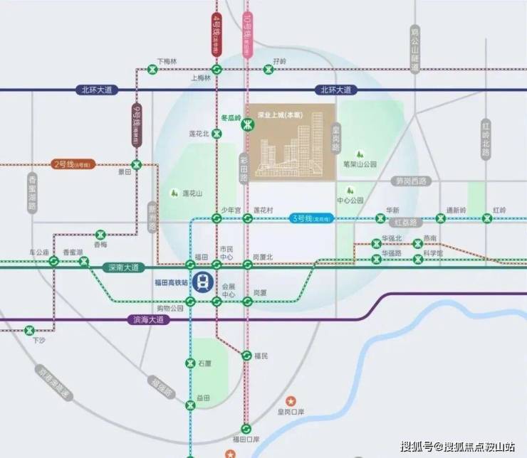 无缝接驳地铁10号线冬瓜岭站,纵享福田“一中枢、双口岸、四核心”枢纽体系,再造引桥匝道升级微循交通体系,高效互联湾区城市与全球资本。