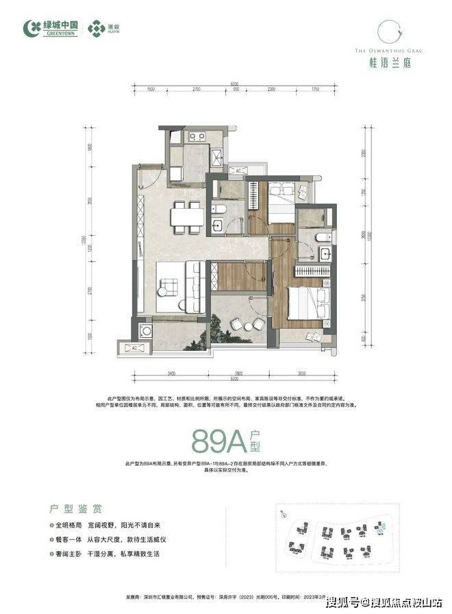 项目是绿城进入深圳的第一个盘,分两期开发,总占地面积约3.44万㎡,总建筑面积约31.8万㎡,一共9栋29-49层的高层住宅,总户数2226户。其中商品房1319套,人才房907套,人才房占比约40%。项目已经是现房了,一期带精装交付,二期带简装交付,买完就能住。