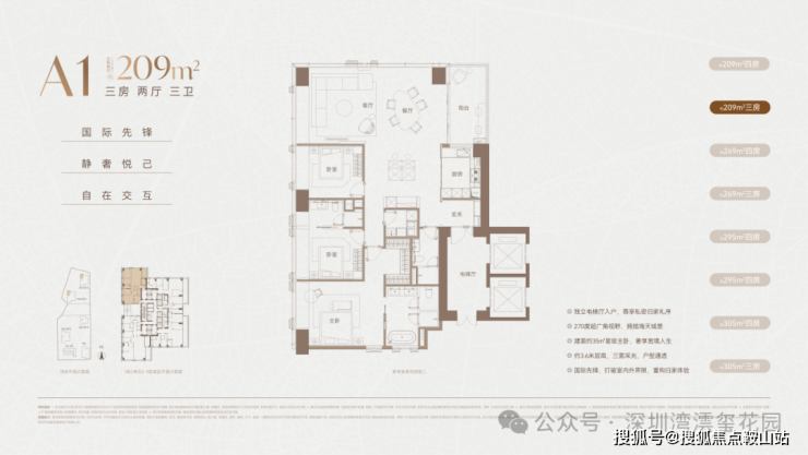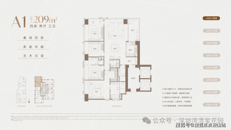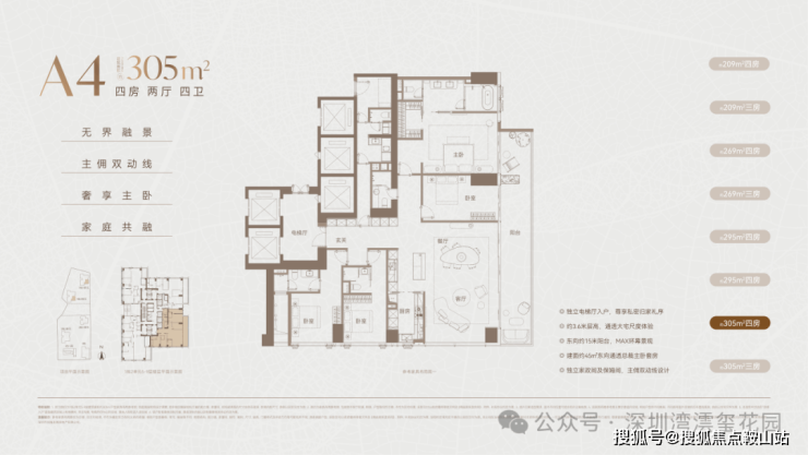 ①中低区4层起(150米以内)是约:209-304㎡四房纯粹大户型;