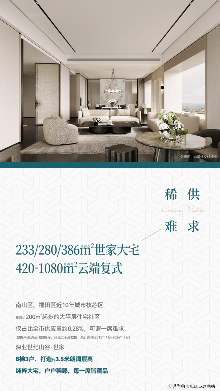 拥有深湾侨城核心景观的深业世纪山谷,推出深圳绝版级别的全新大平层住宅——深业世纪山谷·世家,建面约233-280-386㎡纯大户型,位于项目3栋AB座,近百米的楼间距,8梯3户、拥有头排高尔夫景观,私密性和格调拉满。