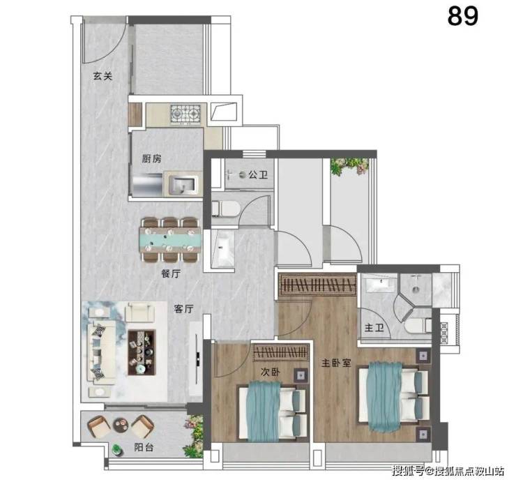 而89平的户型是2+2房2厅2卫,买两房得四房,性价比高。