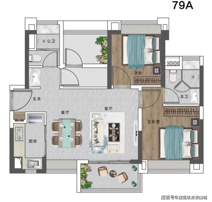 79平的是2+1房2厅2卫的户型,N+1多变灵动空间,空间利用率高。三开间朝南,主卧带独立卫生间,私密性较好。值得一提的是,这个户型还是该区域面积最小的三房