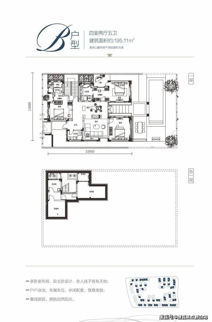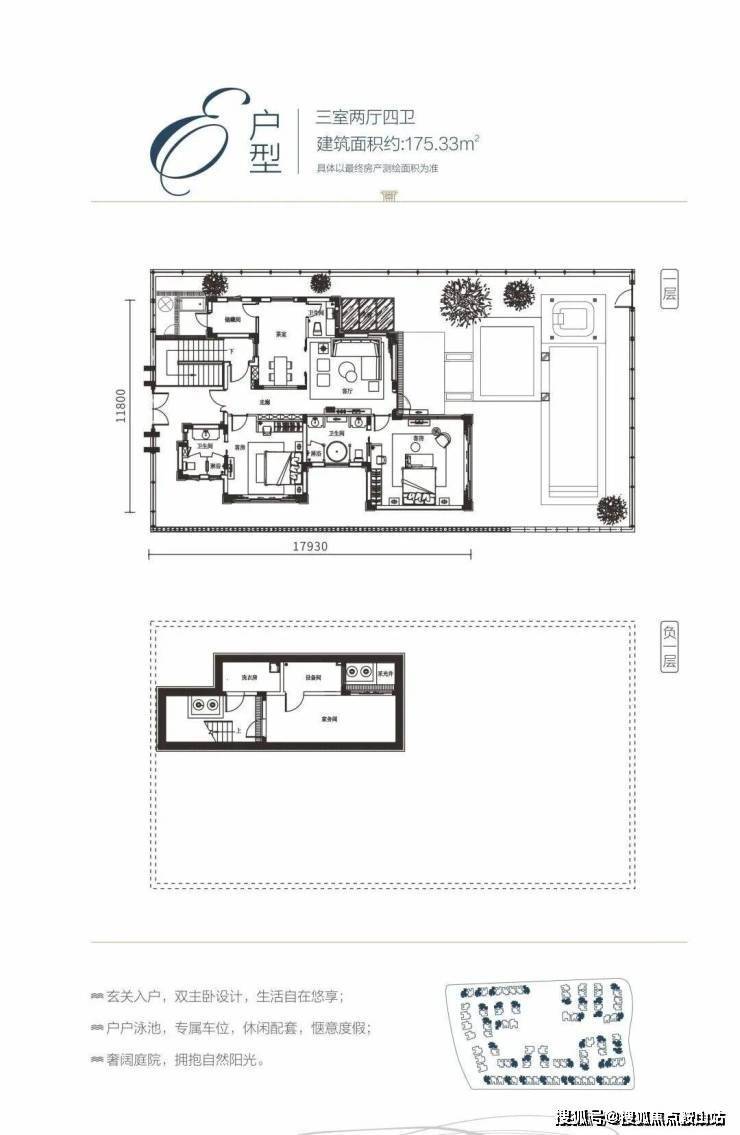 户型信息:有多种户型可供选择,E 户型为三室两厅四卫,建面约 175.33㎡,可拓展面积约 111㎡,占地面积约 332-1020㎡;B 户型为四室两厅五卫,建面约 195.11㎡,可拓展面积约 160㎡,占地面积约 332-998㎡;D 户型为五室两厅六卫,建面约 275.78㎡,可拓展面积约 166㎡,占地面积约 557-1366㎡。