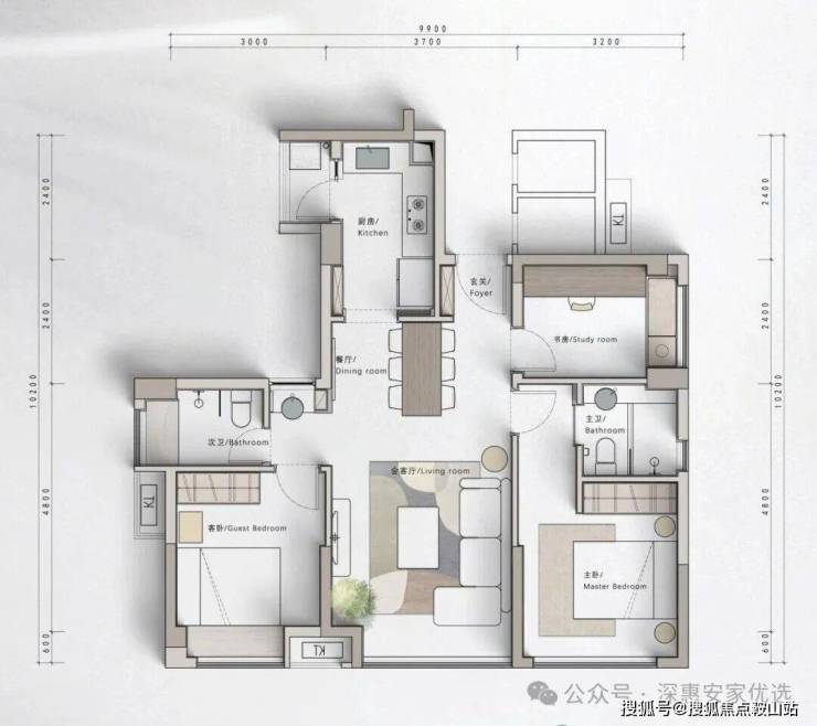 A1户型:89㎡横厅,使用率接近百分之百,相当于市场105平的户型
