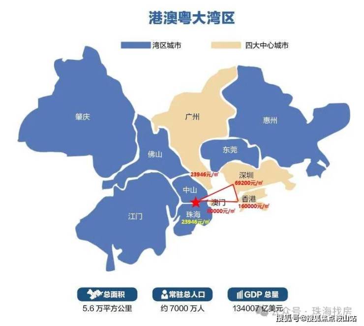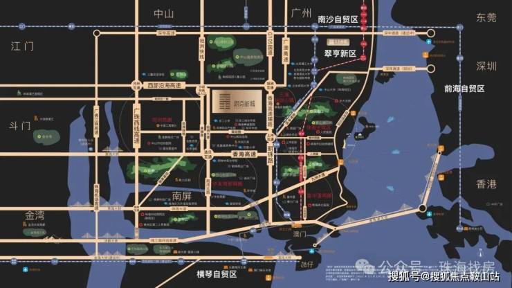 地处粤港澳大湾区几何中心,珠海、广州、深圳、香港、澳门环绕。1分钟到珠海香洲,5分钟抵香洲中心,房价差约1/4。
