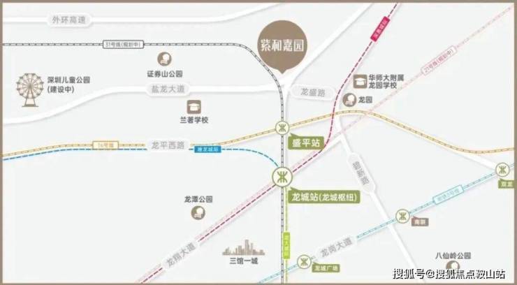 在轨道交通上,项目近邻16号线盛平站,同时周边还规划了地铁31号线:另外,在建的龙城枢纽站规划为地铁21号线。深惠城际线、塘龙城际线、地铁31号线四线交汇,届时项目可于此快速换乘通达全城。