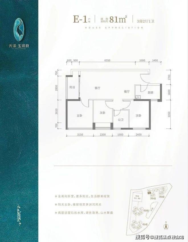 E1户型-80㎡-3房2厅1卫,2栋A座04户型,设计的是竖厅格局,客厅3.5米开间,餐客厅一体化,3个房间宽度分别为3.15/2.4/2.2米,除了厨房跟E2户型有点差异,其它格局都是一样的,得房率:84.3%(包含赠送),阳台进深1.5米,朝西南向。