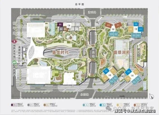 盛璟润府,总占地面积约1.79万㎡,总建筑面积约13万㎡,计容建筑面积约10.2万㎡,容积率4.85,绿化率25%,共由4栋总高45F的住宅组成,分别是2栋A/B/C/D座,还规划有1所幼儿园。