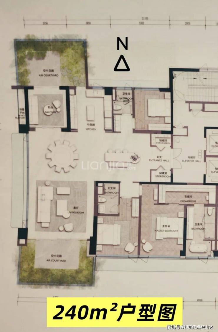 建面约 240㎡ 四房两厅三卫:南北双露台设计,南向 6 米挑高空中花园超 40㎡全赠送,20 米南向巨幕面宽,70㎡社交大通厅,主卧面积超 35㎡,带步入式衣帽间与独立卫浴双台盆,空间尺度感拉满。