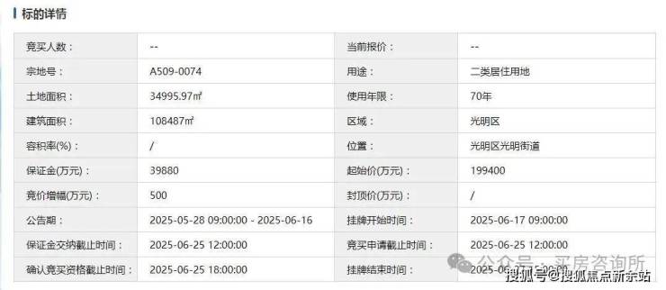 今年(6月27日),光明中心区宅地(宗地号A509-0074)由深振业、天健、深建辰投资联合体以底价19.94亿竞得。成交楼面价18380元/㎡。