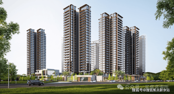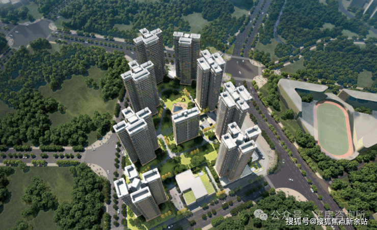 从效果图上看,项目规划9栋住宅和1所幼儿园,8栋塔楼约26层高和1栋十几层的板楼结合,采用合式布局。