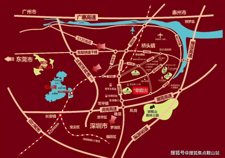 宏远帝庭山位于东莞东部桥头东深路侧,地处穗港深经济走廊,莞惠桥头堡,区位 十分突出。东莞南北纵线主动脉——东深路,瞬时直达深圳及东莞各镇区。项目距离京九铁路、广梅汕铁路和广深铁路交汇点的常平东莞站仅8公里, 轻轨R3线,依托石水口公园、莲湖公园的原生态自然景观资源,致力打造成东莞东首席公园生活社区,项目自身拥有10000㎡ 社区商业,提供业主日常便利,为业主提供安全舒适的生活保证。