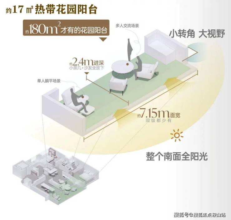约17㎡的热带花园阳台做到约7.15m面宽、约2.4m的进深,为主人提供了户外的延伸空间。