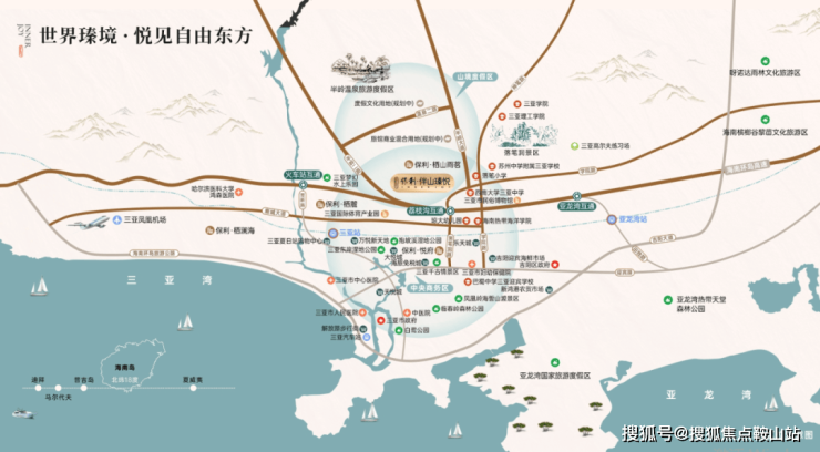 项目紧邻承载自贸创新、城市服务、政务服务和生态宜居为一体的抱坡新城三亚新中心,出则尽享城市便利交通及繁华配套、入则奢享人文山境风光,离尘不离城的度假胜境