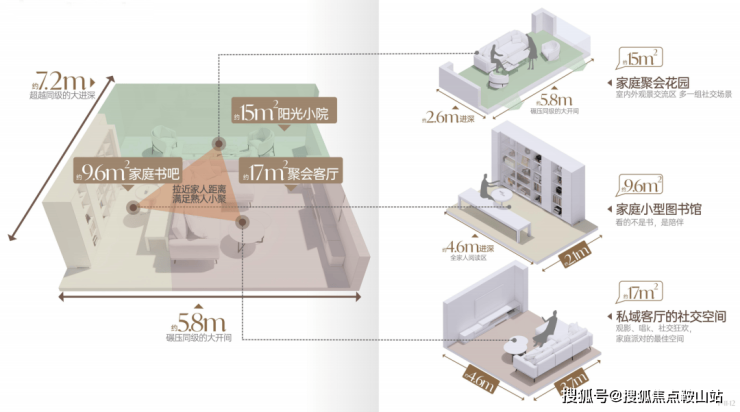 整体三开间朝南布局,使得拥有更多采光同时尽揽一园三堂四季风景,室内鲜氧充沛穿行。