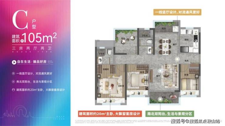 建面约105㎡3房,为全明户型设计,采光通风效果优越;