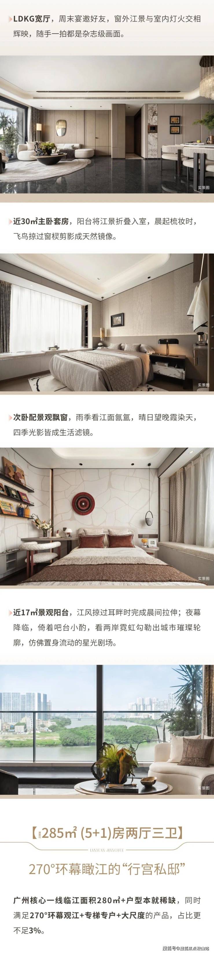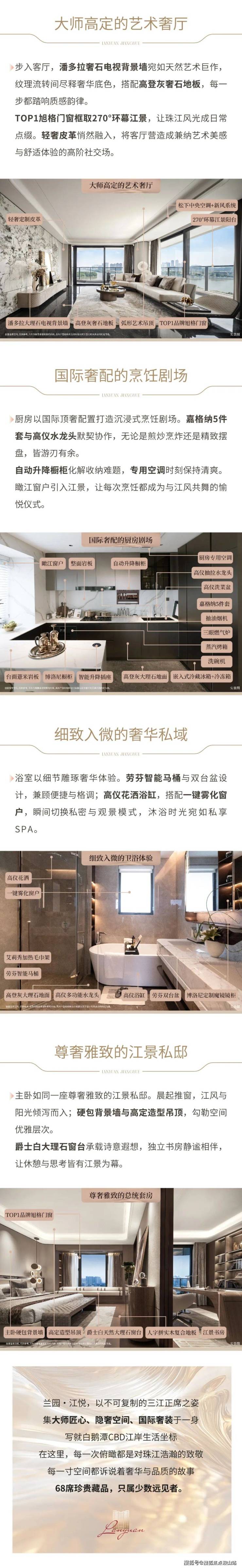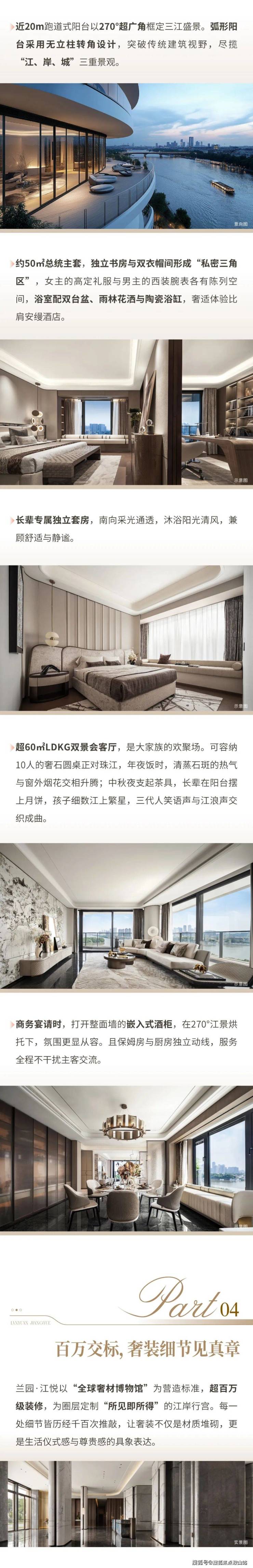 兰园・江悦 约285㎡江幕大平层 🌊为时代领航者定制生活勋章🏅不只是空间的奢华表达✨更划定珠江岸“峯居生活”新高度🏡约60㎡LDK 社交场|定制圈层排场新体验🥂餐厨客无界融合,打破空间桎梏商务磋商、家族宴叙自如切换每一次社交,都是塔尖圈层的风尚秀场270° 环幕瞰江阳台|私藏珠江四季风华🌁晨光中观江浪奔涌,暮色里赏城芯霓虹一境尽揽珠江万千景致煮茶观云,让生活的诗意在此肆意铺展近50㎡总统级主卧|私享峯层谧境奢居🛏️专属的身心奢养天地独立书房、高定卫浴、双衣帽间加持奢适与安然私享,每一刻都是峯层人物的身心疗愈时刻