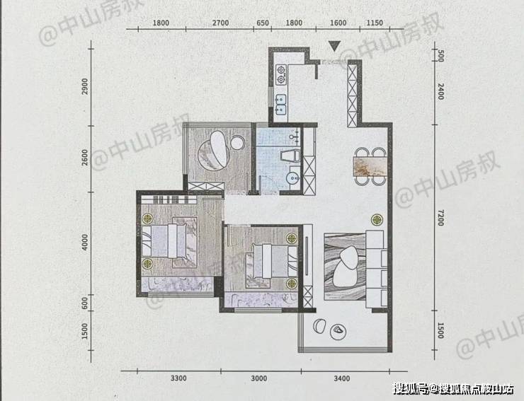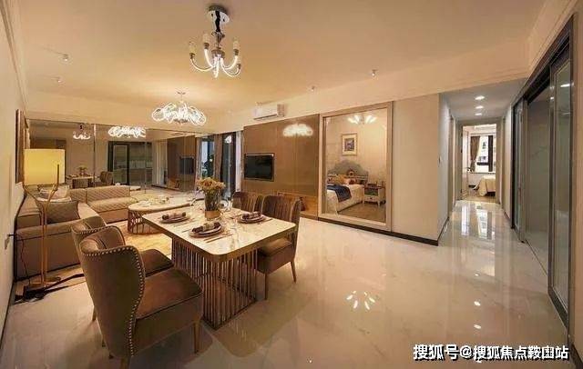 餐客厅同开间,南向连通约3.4米阳台。北向次卧双面采光,是270°的景观视野。
