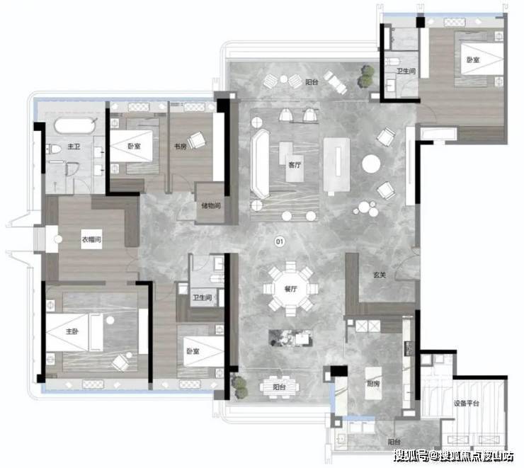 南北打造了11个采光面,户型延续了LDKG大方厅设计,客厅超大面宽,中西厨随意切换,且配置了3个阳台,大空间、观景面和通风采光通通到位。