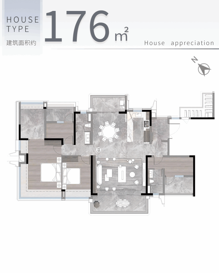 建面约176平方米户型:三梯三户设计,独梯入户,南北双阳台,主卧270度飘窗,得房率高,居住舒适度极佳。