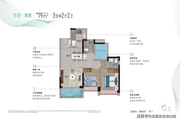 入户玄关、U型厨房、客餐厨三连厅、多功能灵动空间、卧室大飘窗等标配,这个户型通通都有,主客卫设计,相当新颖。